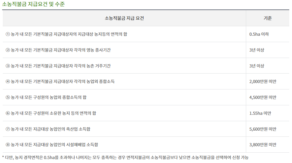 소규모 농가를 위한 소농직불금의 경우, 일정 소득 이하, 일정 면적 이하의 농가에 별도 지급됩니다. 2025년 기준, 연 소득 3,700만원 이하이면서 경작 면적이 0.5헥타르(약 1,500평) 이하인 경우가 주 대상이에요.
