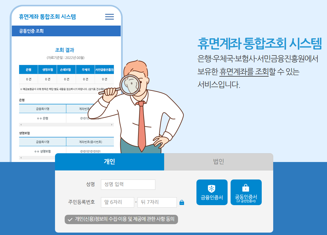 휴면계좌 통합조회 시스템은 은행, 보엄사, 우체국, 새마을금고 등 다양한 금융기관에 흩어져 있는 본인 명의의 휴면계좌를 한 번에 조회할 수 있는 서비스예요.