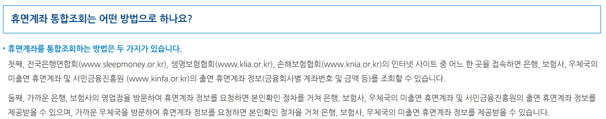 이러한 계좌는 고객이 잊고 지나가기 쉬운 만큼, 관련 기관들은 통합조회 서비스를 통해 정보를 쉽게 제공하고 있어요.