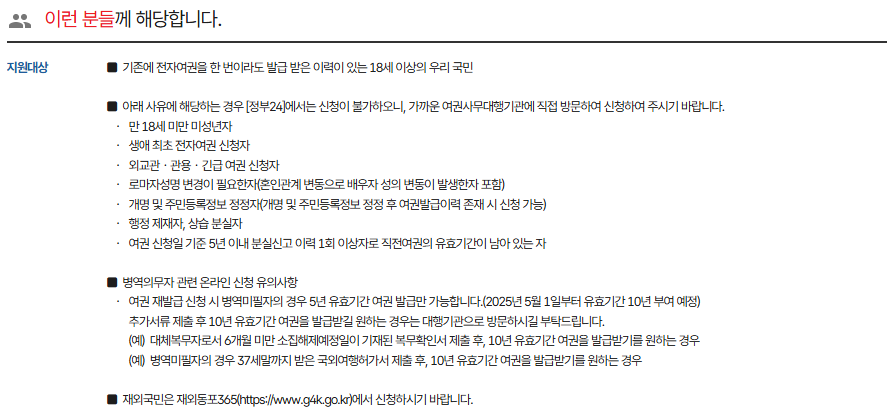 미성년자, 병역 미필자, 이름 변경자 등은 온라인 신청이 불가능하며 반드시 직접 방문 접수를 해야 해요. 또한 기존 여권이 분실된 경우도 온라인 신청이 제한되니 주의가 필요해요.