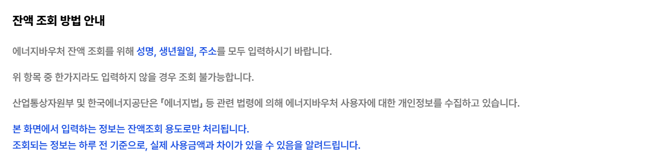 홈페이지 주소는 www.energyv.or.kr이며, 메인 화면에서 ‘잔액 조회’ 메뉴를 클릭하면 됩니다.