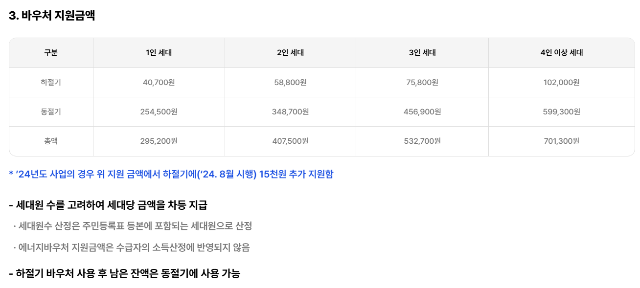 1인 세대는 하절기와 동절기를 합산해 총 310,200원을 지원받고, 2인 세대는 437,600원, 3인 세대는 620,700원, 4인 이상 세대는 최대 716,300원까지 받을 수 있어요.