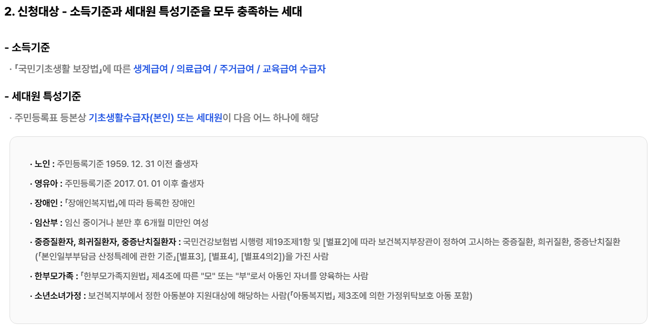 예를 들어, 본인 또는 가구원이 만 65세 이상 노인, 만 6세 미만 영유아, 장애인 등록증을 보유한 경우, 신청 자격이 주어집니다. 단, 교육급여 수급자나 조건을 충족하지 않는 주거급여 수급자는 제외될 수 있어요.