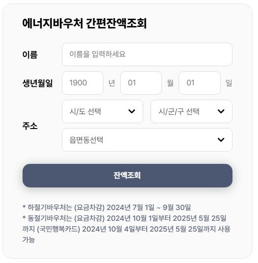 이후에는 이름, 생년월일, 주소 일부를 입력하고 ‘조회’ 버튼을 누르면, 현재 남아 있는 바우처 금액이 바로 확인돼요. 단, 입력한 정보가 주민등록상 정보와 다르면 조회되지 않으니 주의해야 해요.