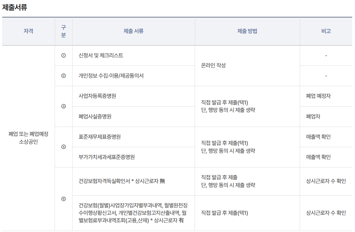 기본적으로 ‘폐업한 소상공인’ 혹은 ‘폐업 예정자’만이 신청 대상이며, 폐업일 기준 5년 이내여야 신청이 가능해요.