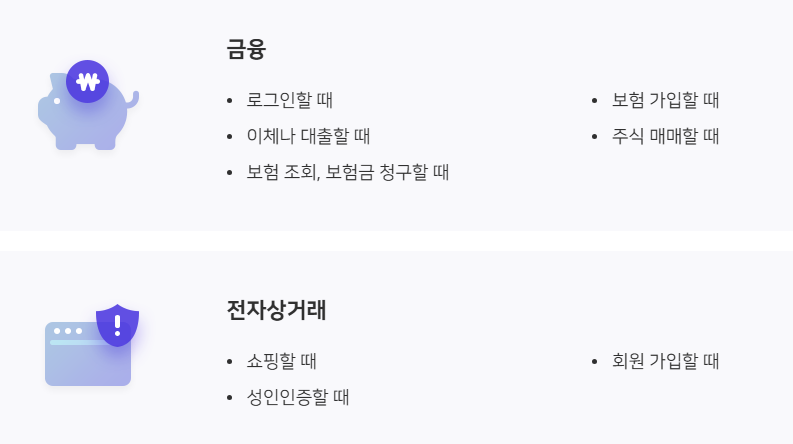 대부분의 인증기관은 금융기관과 연동되어 있기 때문에 본인 인증 수단이 다양하게 활용돼요.