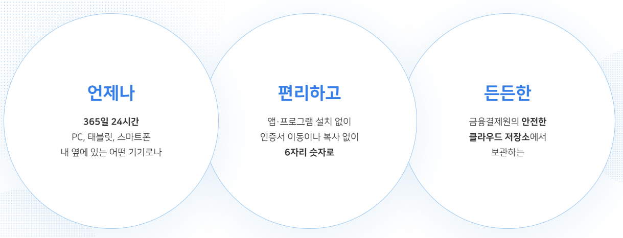 금융인증서는 클라우드 저장 기반으로 발급되며, 생체인식이나 간편비밀번호 설정만으로 이용할 수 있어 보안성과 접근성이 매우 뛰어나요.
