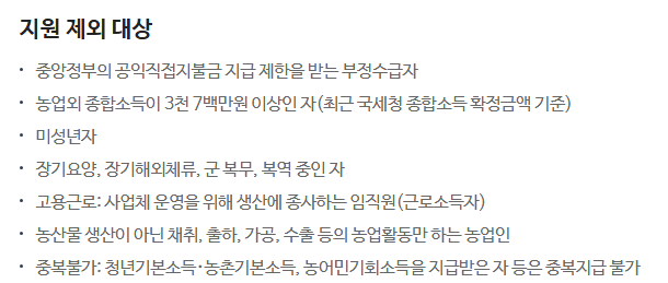 농민수당은 농업 외 소득이 일정 수준 이상인 경우, 혹은 공무원 및 교직원 퇴직 후 연금 수령 중인 경우 등에서 제외될 수 있어요.