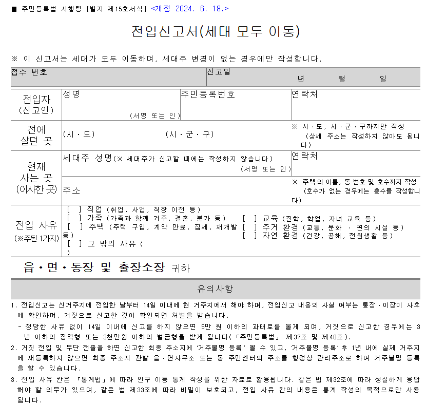 🔽 전입신고 서식 내려받기 🔽