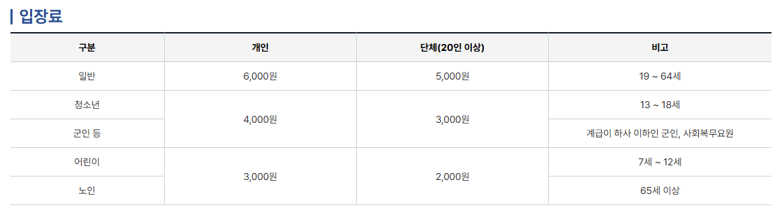 2025년 기준 일반 성인 입장료는 5,000원이며 청소년은 4,000원, 어린이는 3,000원으로 책정되어 있어요.