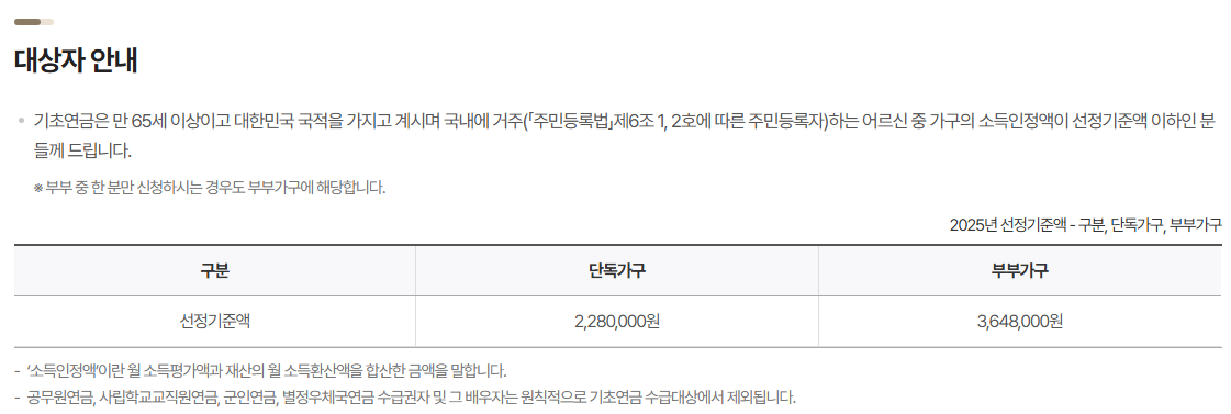 기초연금은 만 65세 이상이며, 소득인정액이 단독가구 기준 2025년 약 218만 원 이하일 경우에 수급 자격이 주어져요.