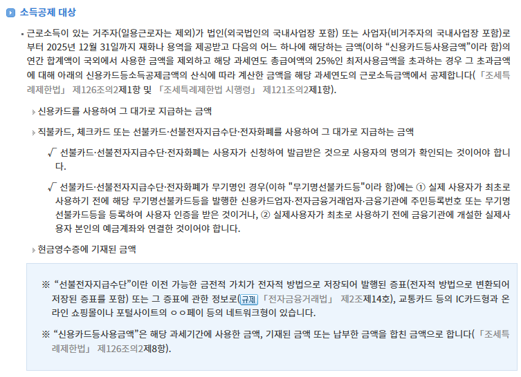 연말정산 신용카드공제는 총 급여의 25% 초과 사용분에 대해 적용돼요.