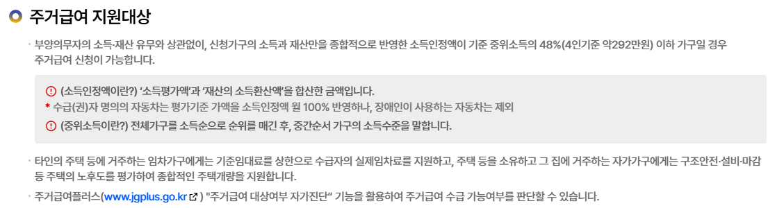 주거급여는 기준 중위소득 48% 이하 가구라면 누구나 신청할 수 있어요.