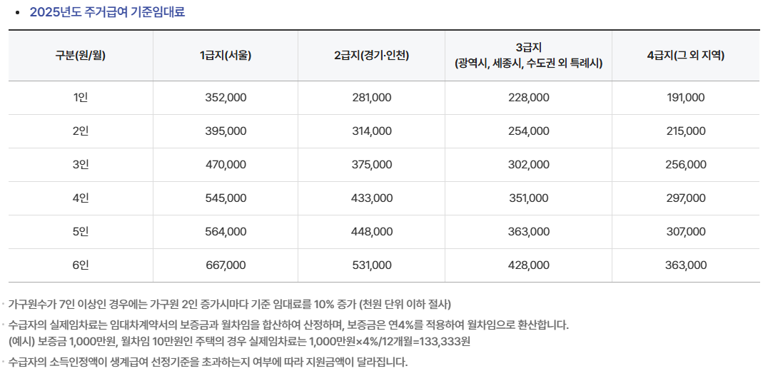 주거급여 지원금액은 어디에 사느냐와 몇 명이 사느냐에 따라 달라지는 구조예요.