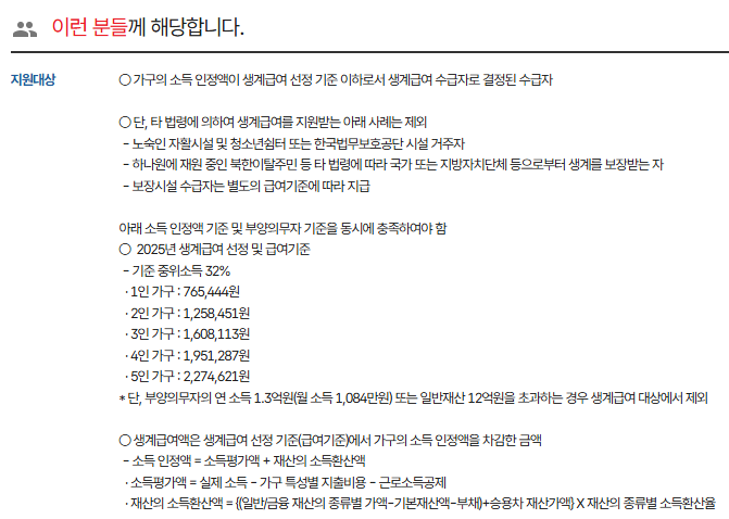 2025년에는 기준 중위소득이 32%로 상향되면서, 생계급여 지원 금액도 함께 인상되었어요. 예를 들어 1인 가구의 경우 월 최대 765,444원까지 지원받을 수 있게 되었죠.