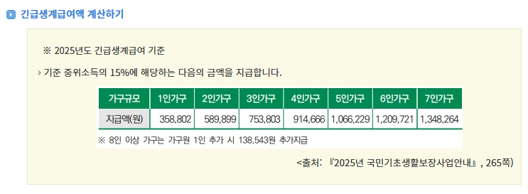 2025년 생계급여 금액은 가구원 수에 따라 차등 적용돼요. 2인 가구는 약 1,268,254원, 3인 가구는 약 1,634,035원, 4인 가구는 약 1,995,948원까지 지원됩니다.
