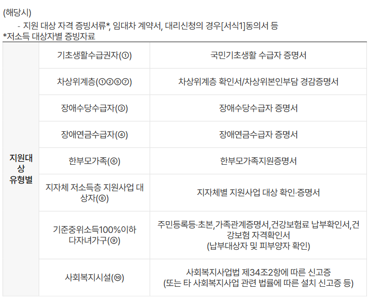 지원 대상은 일반적으로 기초생활수급자, 차상위계층, 한부모가정, 장애인 연금 수급자 등으로 제한되며, 일부 지역에 따라 기준 중위소득 100% 이하 가구도 포함됩니다.