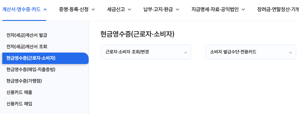 홈택스 홈페이지에 로그인한 뒤 상단 메뉴에서 '현금영수증' 탭을 클릭하면 조회 메뉴가 나옵니다. 여기서 '사용내역 조회' 또는 '소득공제용 발급내역 조회'를 선택하면 됩니다.