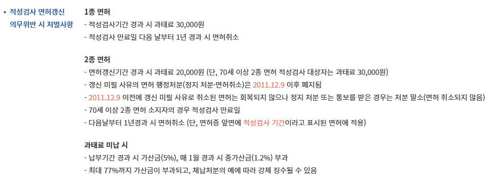 이 시기를 놓치면 과태료가 부과되며, 1년 이상 지연 시에는 면허가 취소될 수도 있어요. 제1종은 3만 원, 제2종은 2만 원의 과태료가 기본입니다.