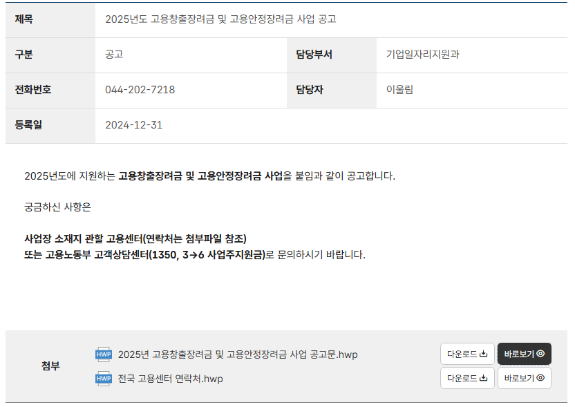 🔽 2025년 고용지원금 사업공고 🔽