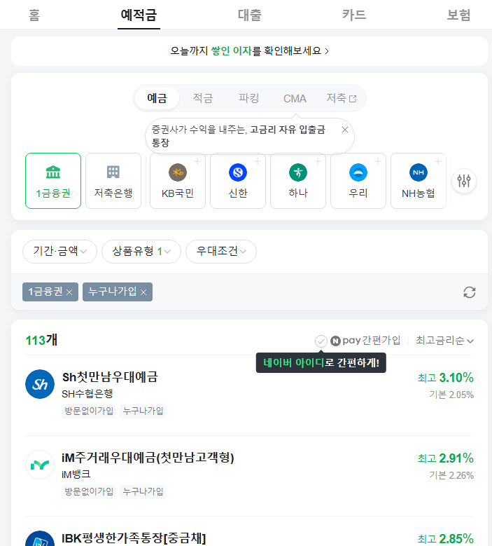 보다 쉽게 여러 금융기관의 정기예금 금리를 비교하고 싶다면, 네이버페이나 뱅크샐러드 같은 비교 플랫폼을 활용해보세요.