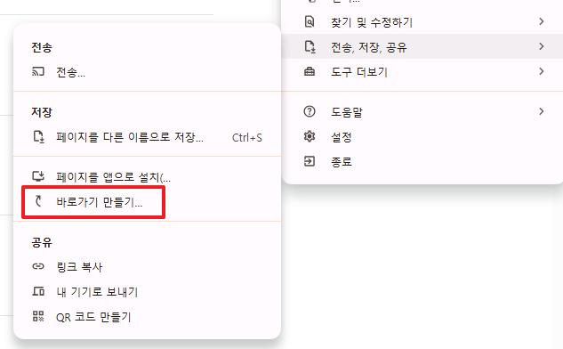 먼저 원하는 홈페이지에 접속한 뒤, 브라우저 오른쪽 상단의 점 세 개(설정) 아이콘을 클릭해 ‘전송, 저장, 공유 → 바로가기 만들기’를 선택하면 돼요.