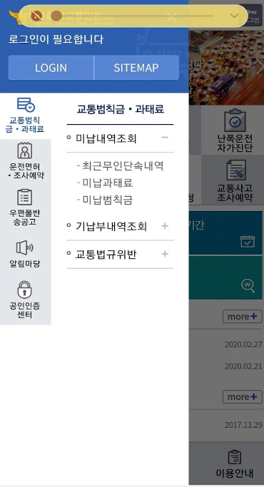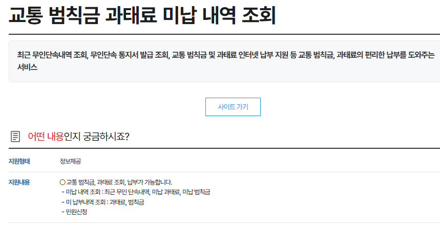 사이트에 접속하면 '교통범칙금 및 과태료 조회/납부' 메뉴를 통해 실시간으로 내역을 확인할 수 있어요.