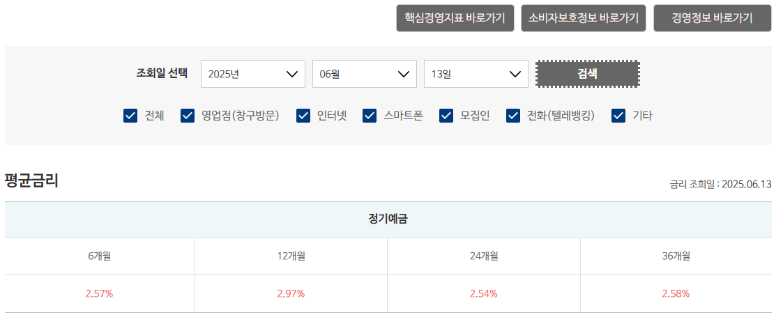 A. 최근 3개월짜리 단기 예금(2.5~2.55%)이 1년(2.50%)보다 약간 높은 경우가 있어요. 단기 전략도 고려해보면 좋아요.