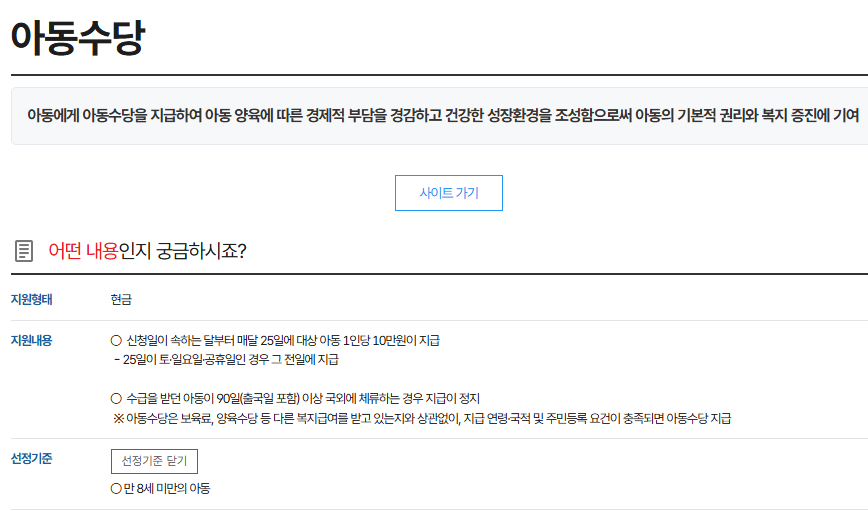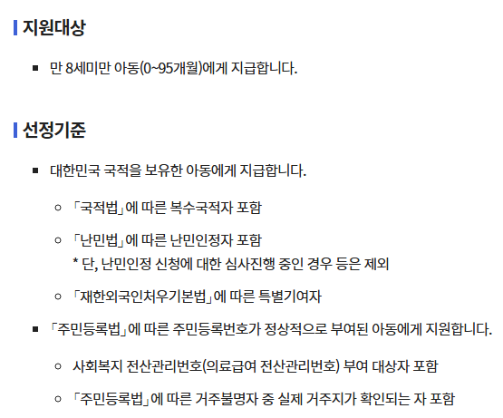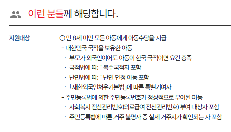 국내 거주 중인 대한민국 국적의 아동이라면 소득과 무관하게 보편적으로 지급된답니다.