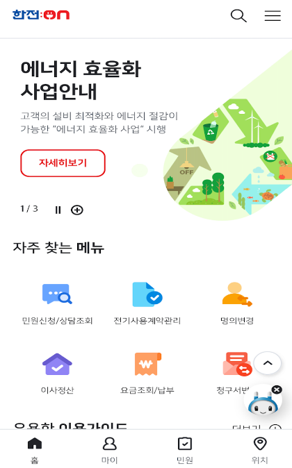 한전의 공식 앱 ‘한전ON’을 설치하면 전기요금조회뿐 아니라 자동이체, 고지서 확인, 전자영수증 발급까지 모두 처리할 수 있어요.