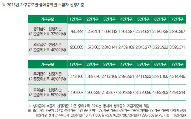 2025년에는 정부가 고시한 기준 중위소득 100% 수치가 인상되었고, 이에 따라 복지 자격 문턱도 조금 달라졌어요.