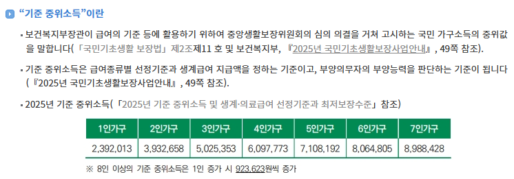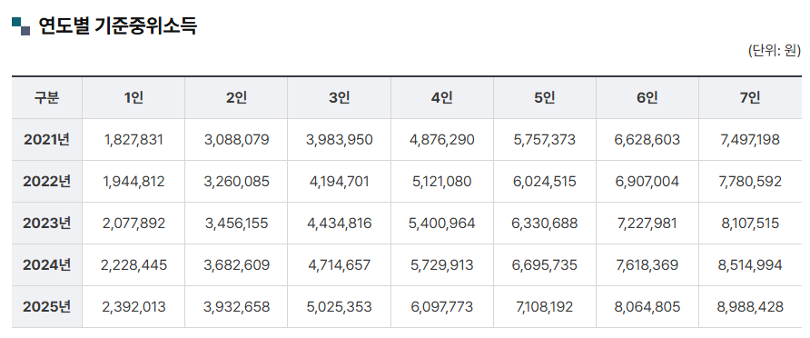 2025년에는 정부가 고시한 기준 중위소득 100% 수치가 인상되었고, 이에 따라 복지 자격 문턱도 조금 달라졌어요.
