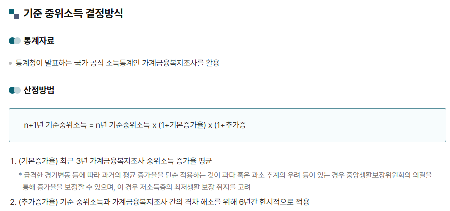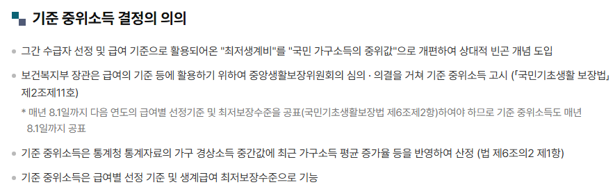 이는 물가 상승률과 사회 평균소득의 변화를 반영해 해마다 조정되며, 복지정책의 자격 판정 기준으로 광범위하게 활용되고 있어요.