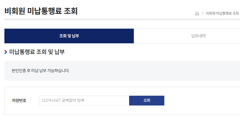 메인 화면에서 '미납통행료 조회/납부' 메뉴를 클릭하면, 차량번호와 본인 인증을 통해 바로 미납 내역을 확인할 수 있어요.