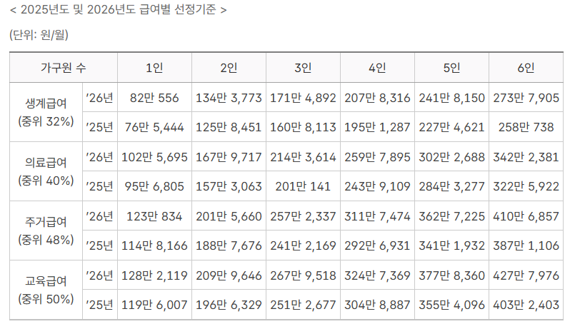 ➤ 2026년 기준 중위소득 4인 가구 기준 월 6,494,738원, 인상률 6.51%로 확정