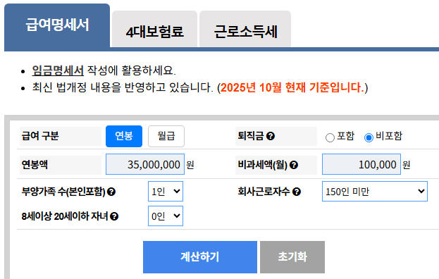 임금계산기 실수령액은 매년 세율 변경이나 4대 보장료 조정에 따라 달라질 수 있습니다.