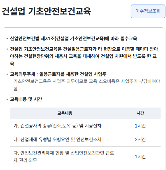 건설업 기초안전보건교육은 산업재해 예방의 기본이자, 법적 의무로 자리 잡은 제도입니다. 해당 교육은 한국산업안전보건공단 공식 포털에서 온라인으로 신청하고 이수증을 발급받을 수 있습니다.