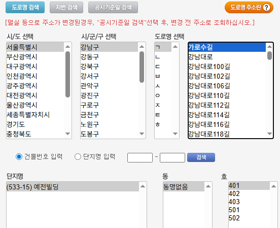 주소 검색 오류가 발생하는 경우 지번과 도로명 주소를 교차 입력하면 보다 정확한 조회가 가능합니다.