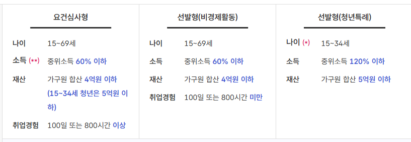 모든 구직자가 신청할 수는 없으며 소득과 재산 그리고 취업 경험 기준을 충족해야 신청 대상이 됩니다.