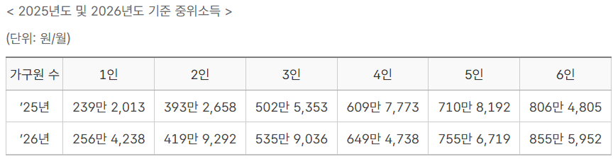 2026년에도 가구 구성에 따른 세부 기준표가 적용될 예정입니다.