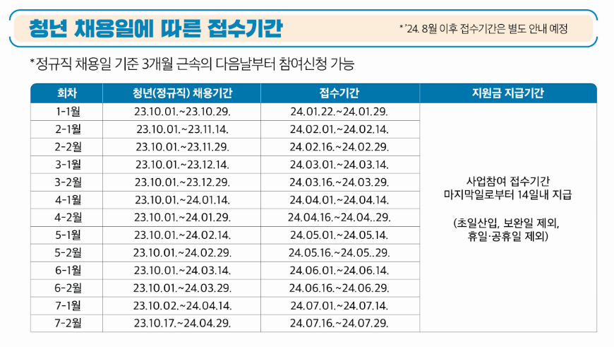 근속기간이 3개월과 6개월이 경과되었을 때 지원금을 신청할 자격이 생기며, 취업애로 청년을 전체 모집인원의 10% 우선 선발하니 꼭 확인해야 합니다.