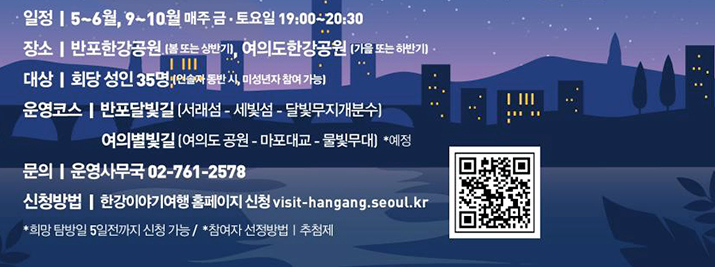 2024년 5~6월에 반포달빛길에서 진행되는 한강 야경투어는 한강이야기여행 홈페이지를 통해서 예약 신청할 수 있습니다.