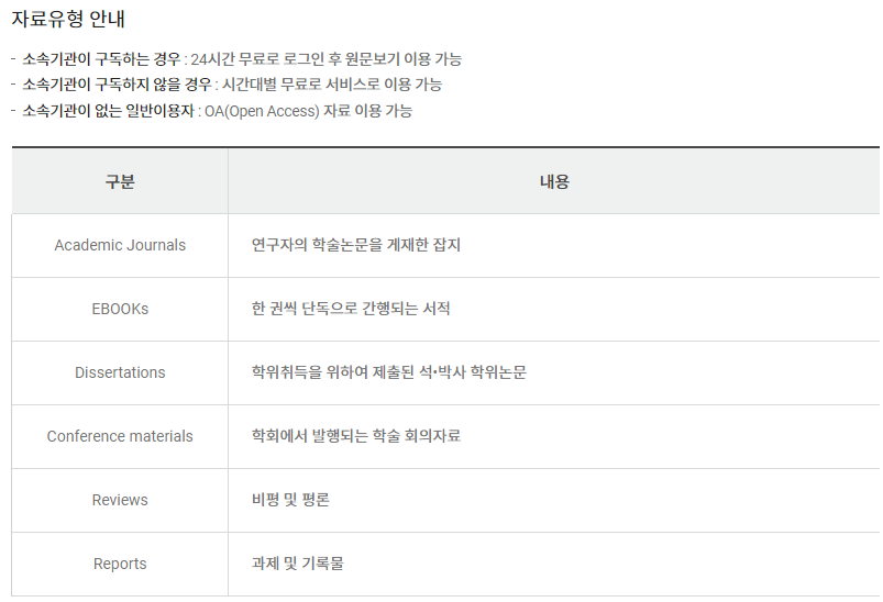 학위 및 학술 논문이나 해외전자자료 등 종류에 따라 무료 또는 유료로 이용할 수 있고 자세한 권한은 RISS 사이트에서 확인해볼 수 있습니다.