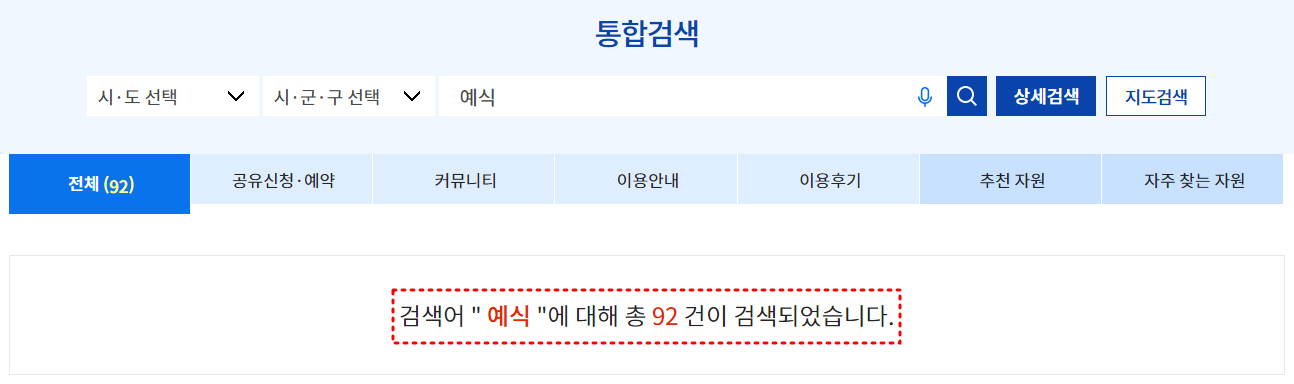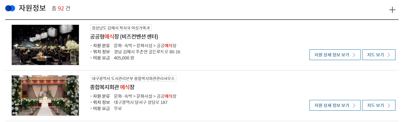 '예식'으로 검색된 결과로 총 92개 예식 공간을 찾아볼 수 있었고, 각 공공 예식장의 위치와 이용요금을 즉시 확인할 수 있습니다.