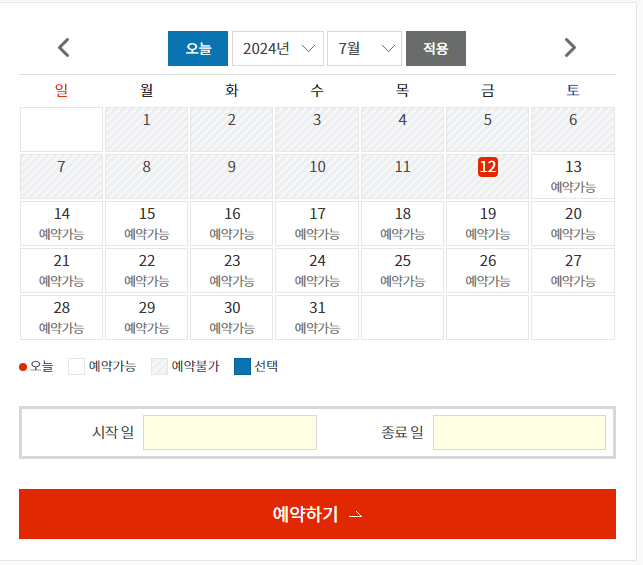 달력에서 예약 가능한 날짜를 선택하고 [예약하기] 버튼을 클릭하세요. 예약수량, 예약인원, 추가옵션 선택, 신청서식 첨부, 신청자 정보 입력 등 예약신청서를 작성해요.