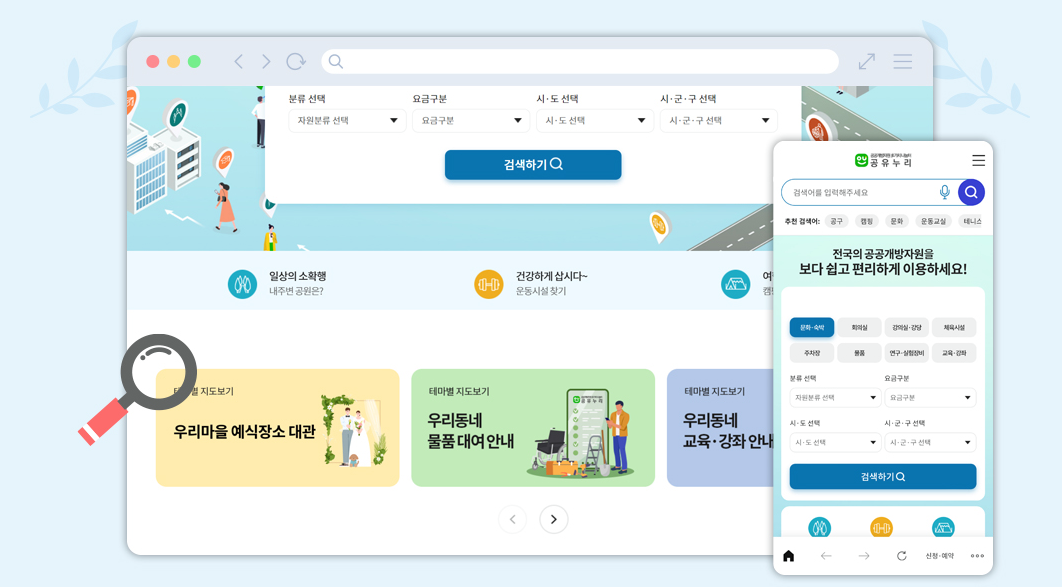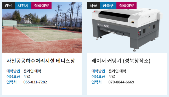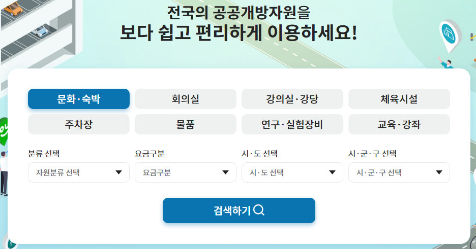 전국에 있는 공공개방자원 들을 무료 또는 저렴한 가격으로 이용하려면 공유누리 포털을 통해서 검색하고 예약을 진행할 수 있습니다.