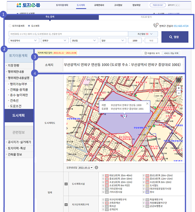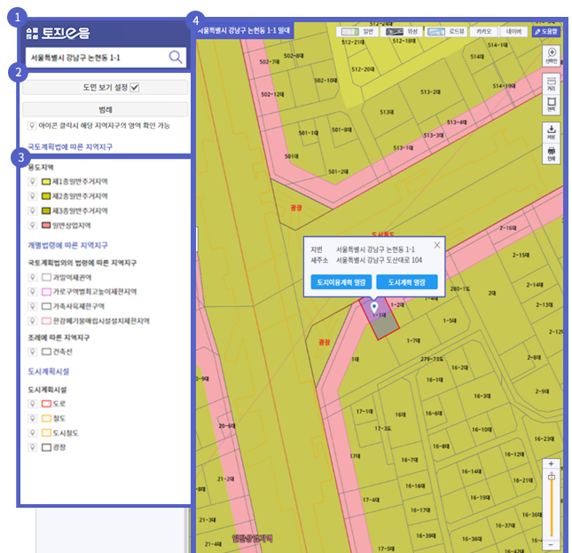 이 정보를 열람하기 위해서는 필지의 지번을 검색하거나 지도를 통해 해당 필지를 선택할 수 있어요. 도시계획도 하단의 범례 아이콘을 클릭하면 도시계획도 내에서 지정 범위를 확인할 수 있어요.