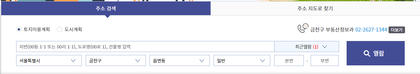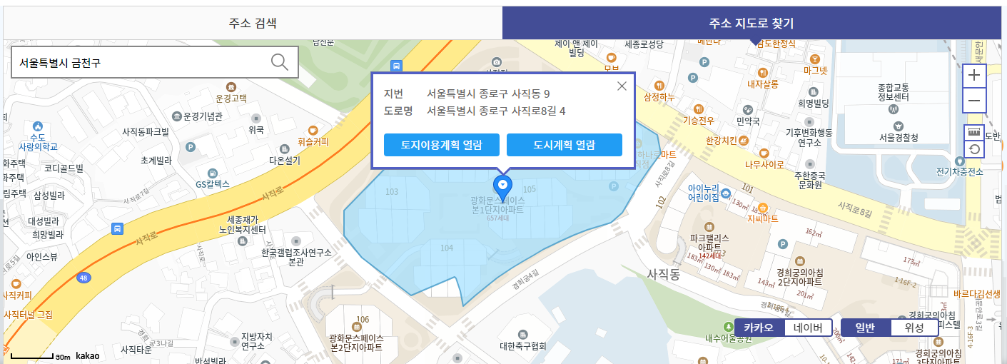 원하는 곳의 위치를 주소로 검색해도 되고 지도를 보고 찾을 수도 있으며, 검색된 위치의 개별공시지가 규제 여부 지적도를 바로 열람해볼 수 있습니다.