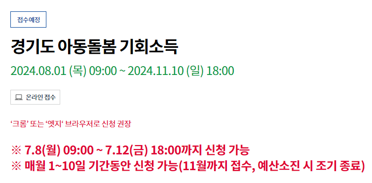 7월 신청기간은 8일부터 12일로 마감되었고, 8월부터 매월 1일부터 10일까지 아동돌봄 기회소득 지원금을 신청할 수 있으니 꼭 기억하셨으면 좋겠습니다.