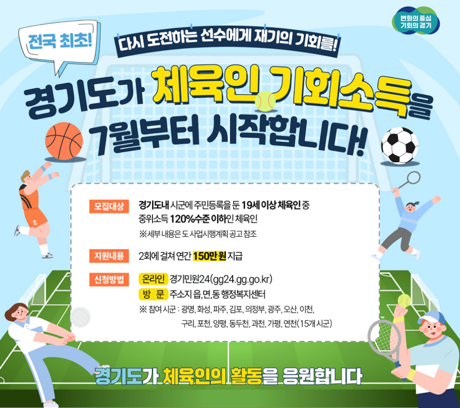 7월 8일 기준 현역선수, 지도자, 심판, 선수 관리자 가운데 경기도 체육인 기회소득 조건을 만족하면 연간 150만원 지원금을 지급받을 수 있습니다.